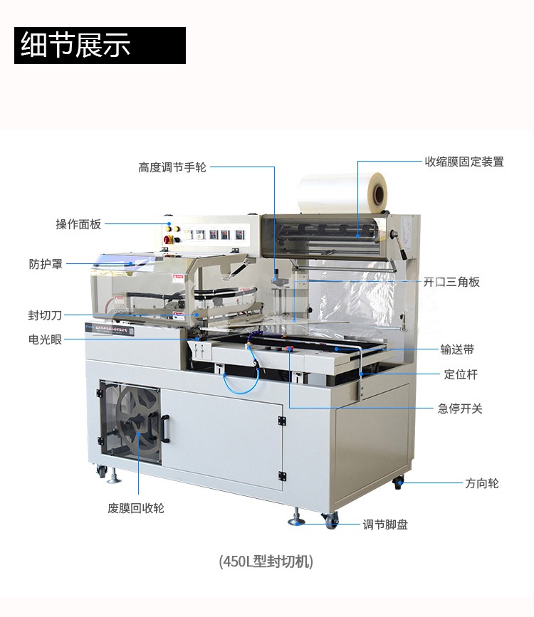 配合L型封切刀使收缩膜包装一次封切成型,镀特氟龙不粘层封口布,封切不黏膜,且封口整齐不开裂,产品经封切后,进入自动塑料膜热收缩包装机完成包装。